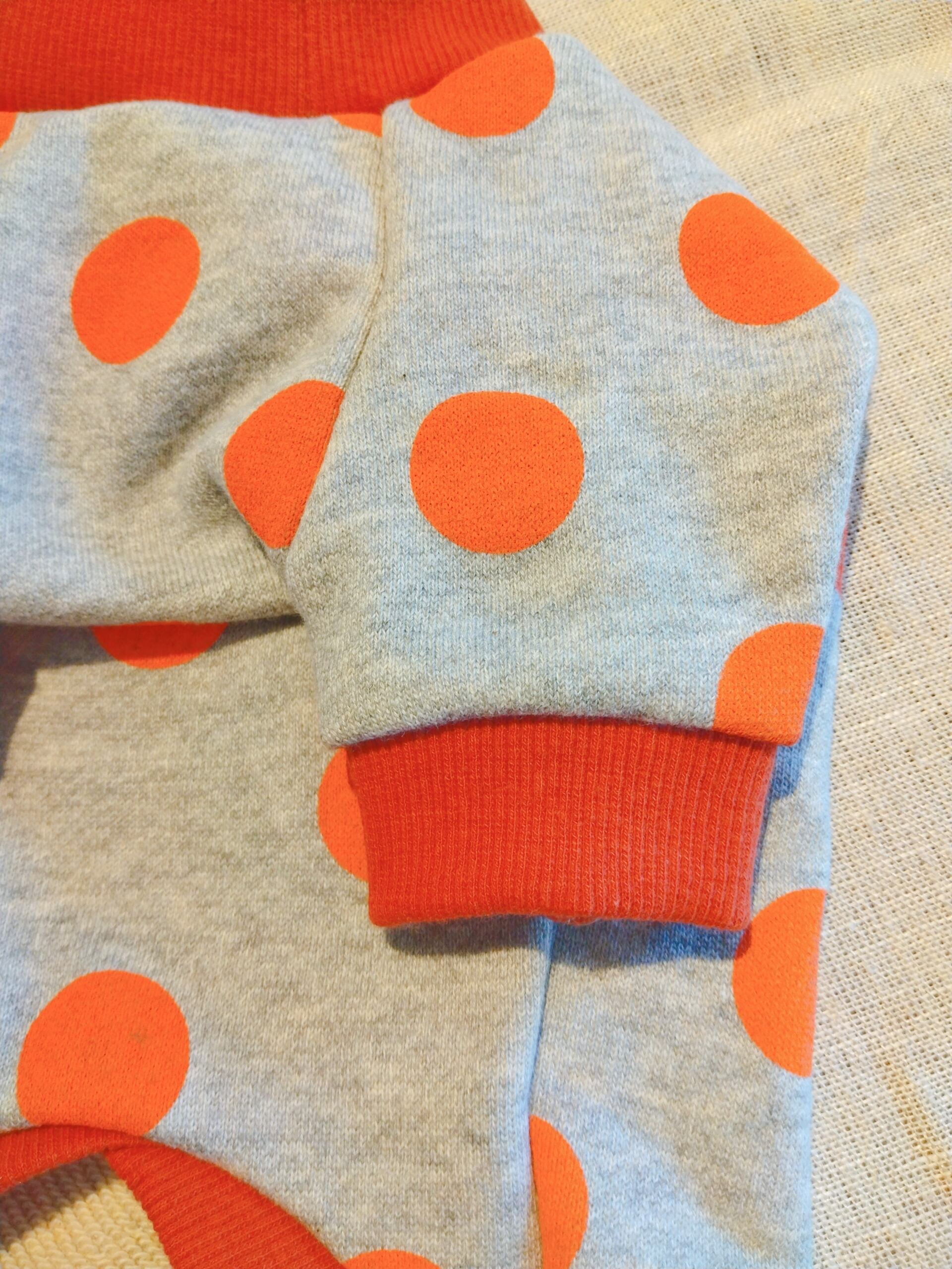 蛍光オレンジのドットのスウェット生地です。リブは、袖口だけ、くすんだオレンジ(写真とおり)